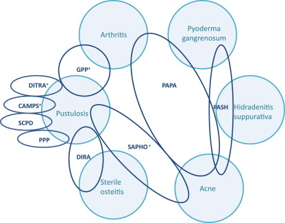 Pyogenic arthritis, pyoderma gangrenosum, and acne compose PAPA syndrome, an autosomal-dominant autoinflammatory syndrome caused by mutations in the PSTPIP1 gene.
