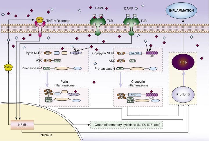 Various molecules that are recognized by cells of the innate immune system mediate the initiation of host response to infection or tissue damage ( Fig. 8-1 ). Chiefly, these are called pathogen-associated molecular patterns (PAMPs), which recognize bacterial and viral components, and danger-associated molecular patterns (DAMPs), which recognize signals related to cell death and toxins. PAMPs and DAMPs interact with pattern recognition receptors such as Toll-like receptors and Nod-like receptors (NLRs), which leads to downstream inflammation. This inflammation is predominantly mediated by the relatively recently described multimeric proteins called inflammasomes. Most autoinflammatory syndromes have genetic mutations in these pathways that lead to increased and inappropriate inflammasome activity ( Table 8-1 ).