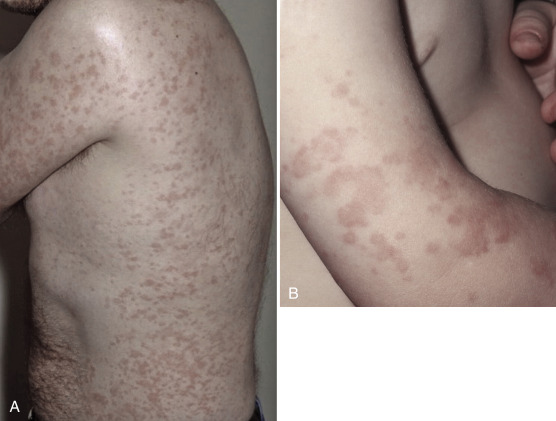 Characteristically, patients present with an urticarial rash in the neonatal period ( Fig. 8-2 ). This differs from chronic urticaria in a number of ways. The rash is present lifelong, tends not to be pruritic although patients may describe heat or tightness in affected skin, and has a circadian rhythm with little or no rash in the morning with progressive worsening as the day progresses. It is associated with constitutional symptoms, which include fever, arthralgia, headache, myalgia, and conjunctival injection. Most patients will describe these inflammatory episodes on a daily basis and furthermore may be precipitated or worsened by other factors like cold exposure. As the clinical severity advances patients may additionally have high-tone sensorineural hearing loss and systemic amyloidosis. The most severely affected patients may have neurological symptoms from raised intracranial pressure resulting in neurological impairment and rapidly progressive deforming arthropathies.