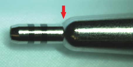 Fig. 66.3 The blunt coring punch with its markings. The red arrow indicates the 4-mm depth limiter.