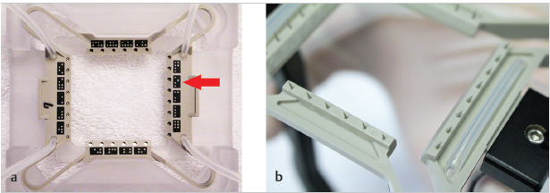 The skin tensioner (ST) is a device to stabilize the skin for accurate insertion of the IN and CP. The ST (Fig. 66.4a) has small pins on each of four sides that engage the skin when the device is applied to the surface. On the opposite side are its fiducial markings that the system reads with its cameras to gain information (Fig. 66.4b). Just prior to the application of the ST, it is compressed with an application device, then pressed onto the donor area; the pins enter the skin and when the device is released, a stretching force is induced.