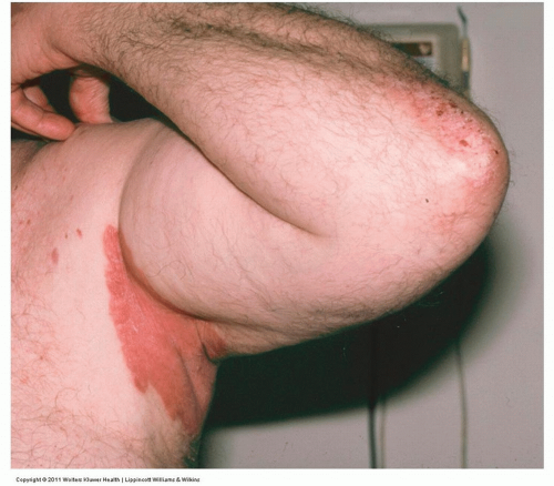 ![]() Figure 12-3 Inverse psoriasis. This is a well-defined pink plaque. Due to occlusion, there is less scale that is typically seen in psoriasis elsewhere such as is present on this man’s elbow. |