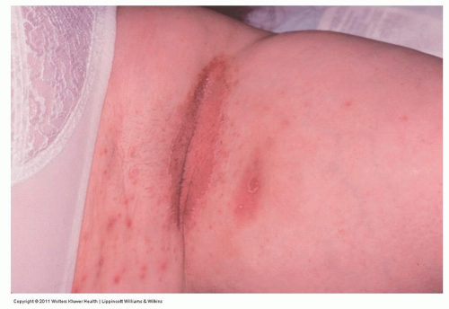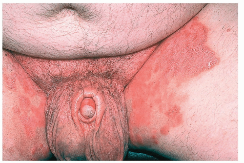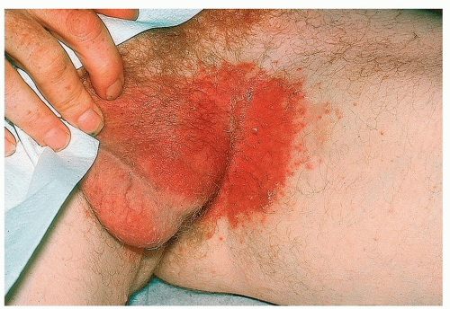 ![]() Figure 12-1 Irritant intertrigo. A moist, red, often macerated rash of the groin in an overweight person is characteristic. This condition is frequently confused with tinea cruris. |