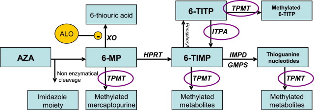 Metabolism of azathioprine. Encircled enzymes indicate that tests are available for these enzymes for assessment of azathioprine’s potential toxicity. ALO, allopurinol; AZA, azathioprine; GMPS, guanosine monophosphate synthetase; HPRT, hypoxanthine phosphoribosyltransferase; IMPD, inosine monophosphate dehydrogenase; ITPA, inosine triphosphate pyrophosphohydrolase; 6-MP, 6-mercaptopurine; 6-TIMP, 6-thioinosine monophosphatase; 6-TITP, 6-thioinosine triphosphatase; TPMT, thiopurine S-methyltransferase; XO, xanthine oxidase.