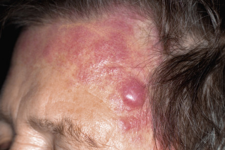 Prominent pink–violet nodule on the lateral forehead with a few telangiectasias. The nodule is surrounded by papules and large infiltrated plaques.