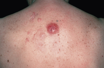 Large nodule on the upper back. Note the surrounding erythematous papules, patches, and plaques (Crosti’s lymphoma).