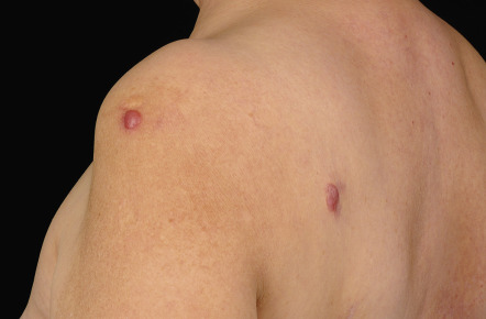 Two well-circumscribed, erythematous nodules on the shoulder.