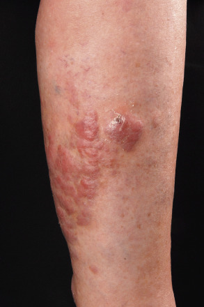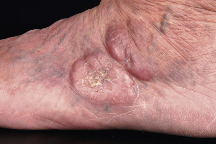 Clinically, patients present with solitary or clustered, erythematous to red–brown nodules, located primarily on the distal aspect of one leg ( Fig. 119.5 ). In some patients, lesions may arise on both lower extremities contemporaneously or within a short interval of time. Ulceration may occur. Small erythematous papules can be seen adjacent to larger nodules. It must be emphasized that in ~20% of patients, tumors with similar morphologic and phenotypic features can arise in areas other than the lower extremities, but the designation DLBCLLT is still applied .