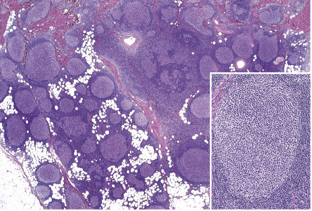 Neoplastic follicles with a monomorphous morphology (lack of polarization). Note the absence of dark and clear areas within the central portion of the follicle (inset).