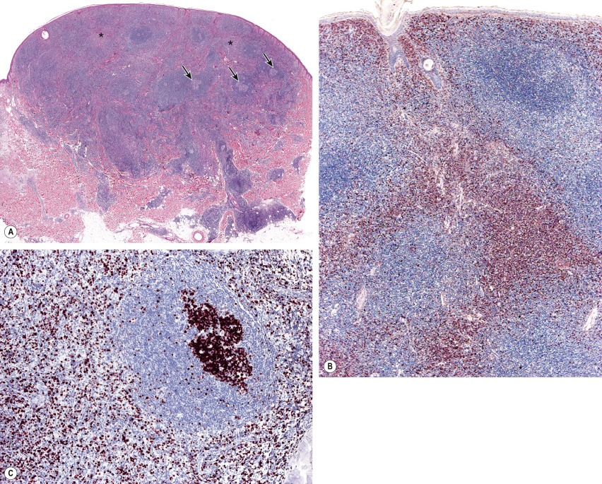 The centrocyte-like cells stain positively for CD20, CD79a, Fc receptor-like 4 (FCRL4/IRTA1) , and Bcl-2; they are negative for CD5, CD10, and Bcl-6. In the overwhelming majority of cases, intracytoplasmic monotypic expression of immunoglobulin light chains (either κ or λ, but not both) can be observed ( Fig. 119.10 ). The monoclonal population of B lymphocytes is often characteristically arranged at the periphery of the cellular aggregates ( Fig. 119.8B ). Staining for proliferation markers also shows increased positivity at the periphery of the nodules (as well as in reactive germinal centers) ( Fig. 119.8C ). IgG4 expression is observed in a minority of cases with plasmacytic differentiation but is not associated with systemic IgG4-related disease . Monoclonal rearrangement of IGH can be detected in the majority of cases (60–80%).