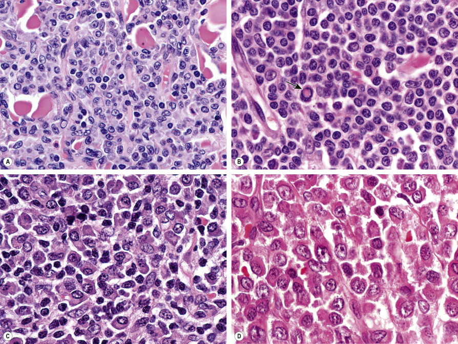 A Admixture of marginal zone cells, plasmacytoid cells, and plasma cells. B Predominance of lymphoplasmacytoid cells (formerly classified as cutaneous immunocytoma; note an intranuclear eosinophilic inclusion [Dutcher body, arrow]). C Predominance of plasma cells (formerly classified as cutaneous plasmacytoma). D Predominance of large blastoid cells similar to plasmablasts.
