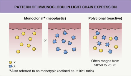 Detection of monoclonal expression of immunoglobulin light chains (κ or λ) is a key diagnostic feature for primary cutaneous marginal zone B-cell lymphoma. Monoclonality is defined as a ≥10 : 1 ratio.