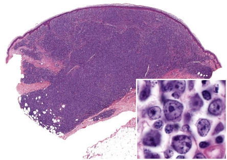 Within the entire dermis, there is a dense, diffuse lymphoid infiltrate. Large cells with a round morphology (mainly immunoblasts) predominate (inset).