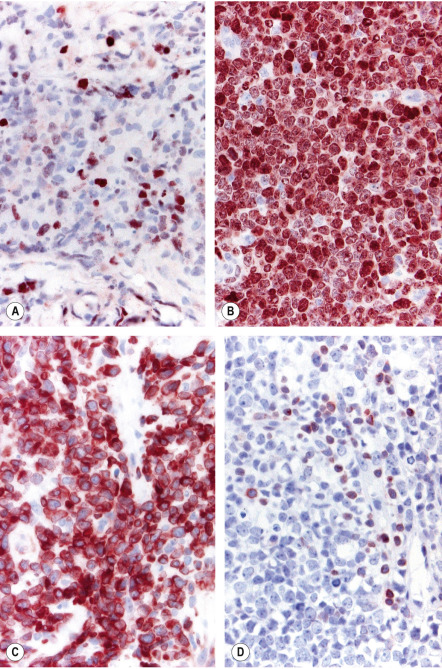 Staining with anti-Bcl-2 antibody shows negativity (except for reactive small lymphocytes) in follicle center lymphoma, diffuse type ( A ) and positivity of most tumor cells in diffuse large B-cell lymphoma, leg type ( B ). Anti-MUM-1 antibody stains virtually all the tumor cells in primary cutaneous diffuse large B-cell lymphoma, leg type ( C ) while only a minority of cells are positive in primary cutaneous follicle center lymphoma, diffuse type ( D ).