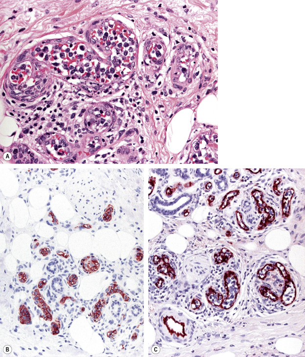 IVDLBCL is characterized by a proliferation of large atypical lymphocytes that fills dilated blood vessels within the dermis and subcutaneous tissues ( Fig. 119.14A ). The malignant cells are large with scanty cytoplasm and often have prominent nucleoli. They are positive for B-cell-associated markers ( Fig. 119.14B ) as well as for Bcl-2, MUM-1 and FOX-P1. Staining with endothelial cell-related antibodies (e.g. CD31, CD34) highlights the characteristic intravascular location of the cells ( Fig. 119.14C ). Molecular analysis shows monoclonal rearrangement of IGH . The genetic profile is similar to that observed in diffuse large B-cell lymphomas, activated B cell type.