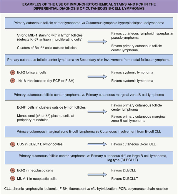 Although differential diagnoses of pCBCLs vary according to the type of lymphoma, in general they include inflammatory processes that may simulate malignant lymphomas clinically and/or histopathologically, referred to as cutaneous lymphoid hyperplasia, lymphocytoma cutis or “pseudolymphoma” (see Ch. 121 ). It must be emphasized that a definitive diagnosis of pCBCL can be reached only after careful examination of the clinical, histopathologic, immunophenotypic and molecular features; in some cases, only repeated examination of the patient and sequential biopsy specimens will allow the correct classification . A schematic diagram with examples of the use of immunohistochemical stains and PCR in the differential diagnosis of pCBCLs is presented in Fig. 119.16 .