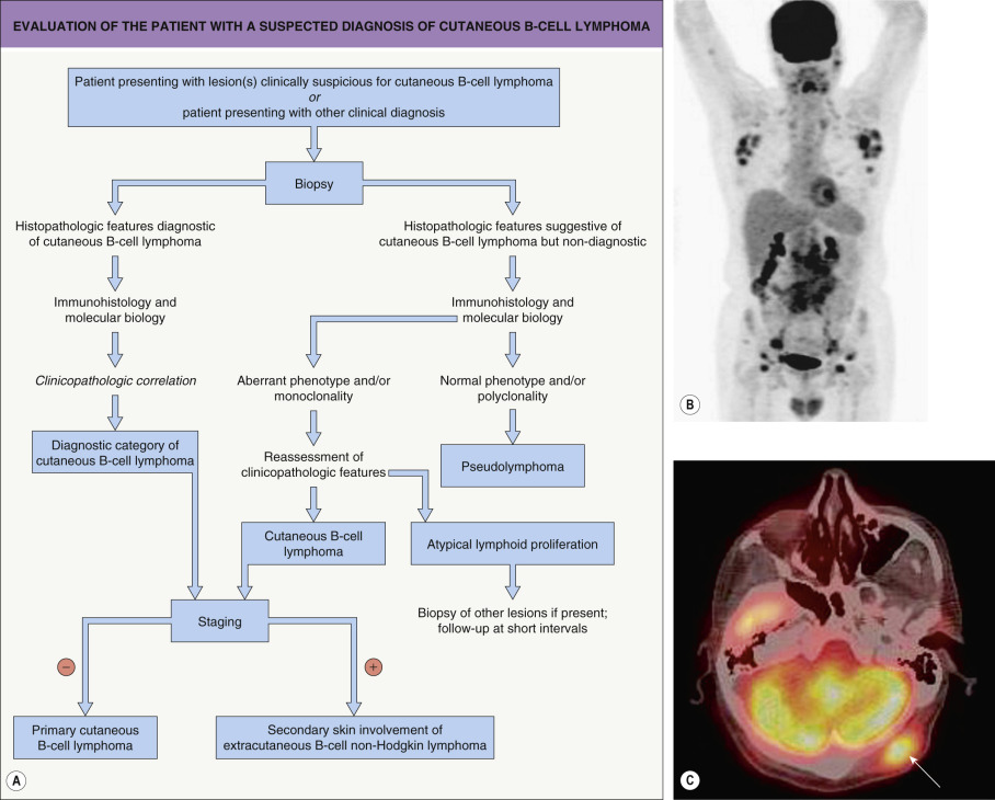 A Algorithm outlining approach to the patient. B, C Positron emission tomography (PET) scans in a 66-year-old patient with stage IV B-cell non-Hodgkin lymphoma. He had a 1-year history of a cutaneous nodule of the scalp that was originally diagnosed as an epidermoid inclusion cyst. Biopsy of the nodule showed a diffuse large B-cell lymphoma (CD10 + , CD20 + , variably Bcl-2 + , MUM-1 ) and a PET-CT scan was performed for staging. There is evidence of widespread disease involving multiple lymph node basins in the dedicated (MIP) image ( B ) as well as a scalp lesion in a PET-CT fusion image ( C ; arrow).