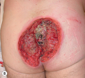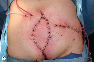(A) Large Marjolin ulcer found in a chronic pilonidal cyst in an ambulatory patient. (B) Tumor excision. (C) A superior gluteal artery perforator flap is drawn out. The long axis of the skin paddle is perpendicular to the long axis of the defect to facilitate closure. The tumor excision and the final closure were staged to allow for definitive pathologic clearance of the margins. (D) Flap inset into defect.