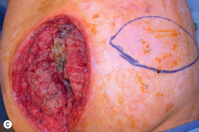 • Rarely, in extremely deep wounds, the pedicled omental flap is ideal to fill the defect and to help achieve closure. These unusual circumstances often also require either erector spinae flaps or latissimus flaps to aid in the closure.