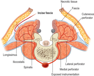 • Spine teams have noted the efficacy of muscle flap closure of open spine wounds, and this has led to the introduction of prophylactic use of muscle flaps at the time of spine surgery. The same algorithms described in the chapter below are used, but now at the time of the back procedure, rather than only when there is a complication.