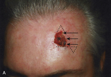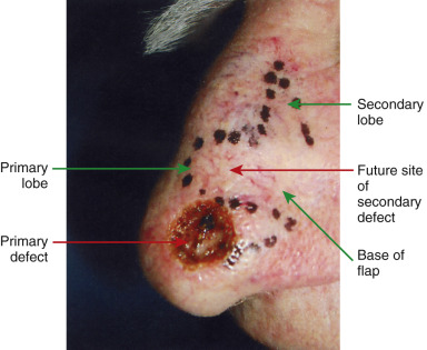 A skin flap is a construct typically consisting of skin and subcutaneous tissue with a partially intact vascular supply that is transferred or repositioned from an adjacent or more distant donor site to a recipient site. The recipient site is called the primary defect and, in dermatologic surgery, is usually the wound resulting from the removal of a cutaneous tumor ( Fig. 2.1 ). The secondary defect is defined as the wound that is created by cutting, lifting, or sliding the flap to fill the primary defect (see Fig. 2.1 ). The base of the flap is the area that remains attached to the skin adjacent to the defect. It is this base, also known as the pedicle of the flap, that contains the vascular supply necessary for initial flap survival. The tip of the flap is the portion of the flap furthest from the flap’s base.