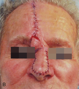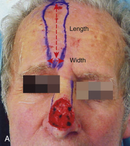 Overall, perfusion pressure limits the ultimate length of both axial and random flaps. The greater the perfusion pressure in the flap’s pedicle, the longer the flap can be without undergoing necrosis. Moreover, the greater the perfusion pressure at the flap’s base, the more narrow the pedicle may be. Arteries always have greater perfusion pressures than distal arterioles and capillaries. Accordingly, the longest viable flaps with the narrowest bases (largest length-to-base ratios) are arterial flaps. Therefore a paramedian forehead flap that uses the supratrochlear artery may be at least four times as long as the flap’s pedicle width (at least a 4 : 1 ratio; Fig. 2.3 ). Musculocutaneous flaps have the next greatest blood supply in the pedicle, followed by fasciocutaneous and random flaps in descending order.