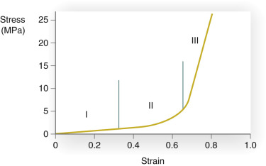 In addition to understanding the skin’s vascular supply and physiology, the surgeon must also appreciate the unique biomechanical properties of the skin if flap surgery is to be successful. All materials have characteristic biomechanical properties: stress, strain, creep, and stress relaxation. In regard to skin, stress is the force applied per cross-sectional area, and strain is the change in length divided by the original length of the given tissue, to which a given force is applied. The stress–strain relationship of skin shows that skin, unlike some other materials, is not truly elastic ( Fig. 2.5 ). As a small amount of stress (or tension) is placed on the skin, there is a corresponding change in the skin’s length (strain). At a certain point on the stress–strain curve (see zone III in Fig. 2.5 ), even a large amount of applied force will not result in further incremental skin stretch. This nonelastic property of skin is mainly due to its structural constituents—collagen and elastin. In relaxed skin, collagen is randomly oriented, and elastin is loosely wrapped around and attached to multiple points on the collagen bundles. When a small amount of force is initially applied to skin, the elastin network is first deformed and the skin is easily lengthened (see zone I in Fig. 2.5 ). With sun exposure and intrinsic aging, there is a progressive decrease in the functional elastic fiber network. As a result, the stress–strain curve is shifted to the right so that when applied to aged or sun-damaged skin, less applied force results in greater lengthening. As continued force is applied, the collagen fibers begin to reorient parallel to the direction of the force (rapid transition of the curve; see zone II in Fig. 2.5 ). At the point where the elastin and collagen fibers are maximally stretched, even a large amount of force will only minimally stretch the skin (see zone III in Fig. 2.5 ). Thus the skin is not truly elastic at all levels of applied tension.