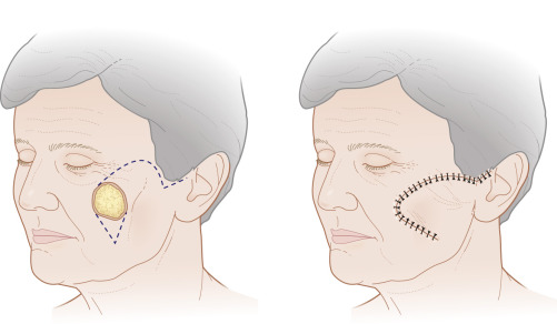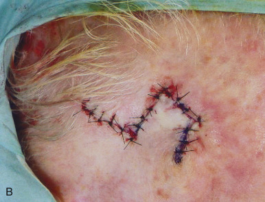Understanding the stress–strain curve is essential for optimal wound closure. When reviewing reconstructive options, it is important to avoid any excessive stress on the defect edges that would force the involved skin into the third part of the stress–strain curve; this involves minimizing tension on the wound closure. Unfavorably high wound closure tensions limit recruitment of skin laxity and can be detrimental to wound healing. Specifically, high tension may lead to wound edge necrosis, wound dehiscence, and cosmetically unacceptable scars (i.e., widened, atrophic, or hypertrophic scars). Wound edge tension may be minimized by appropriate undermining; however, care must be taken to understand and minimize the underlying mechanism of stress or restriction. For example, a galeotomy may be used to release galeal fascial restraint and allow for additional movement of the skin and subcutaneous tissue on the scalp; careful dissection of the skin from the underlying orbicularis muscle in the periocular area creates movement of the skin to allow for tension redistribution away from the free margin; and separating the vertical connections within the subcutaneous tissue of the cheek from the underlying superficial muscular aponeurotic system (SMAS) drastically reduces tension on closures and allows for substantial movement of tissue for closure of large cheek defects.