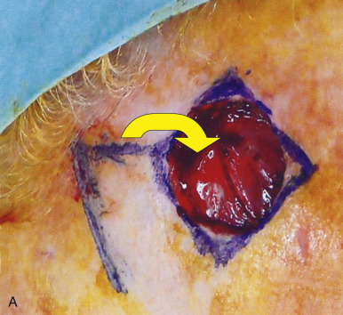 In addition to classifying flaps by their vascularity, flaps are often also categorized by their primary movement directions. The three basic flap movements are advancement, rotation, and transposition. With advancement flaps, the major motion of the flap is largely along a single linear direction toward the primary defect ( Fig. 2.6 ). Rotation flaps are those flaps that are rotated in an arc or curvilinear fashion along a pivot point to fill the adjacent primary defect without crossing any intervening skin ( Fig. 2.7 ). A transposition flap is incised and lifted over intact skin and then placed into the wound ( Fig. 2.8 ). A distinct type of transposition flap is called the interpolation flap. An interpolation flap is a flap, potentially with a predictable, axial vascular supply, that involves two steps or stages. The first stage of the flap is transposing the tissue into the wound with the pedicle overlying the intervening skin. The second stage is separating the flap from its origin and therefore dividing its pedicle.