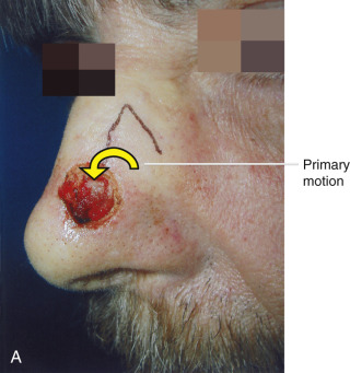As alluded to previously, when discussing the motion of these flaps, the surgeon must understand the tension vector created by the flap’s closure. This vector depends on the primary and secondary motion of the flap. The primary motion of the flap is the tension placed on the flap tissue as it is moved to fill the wound (primary defect) ( Fig. 2.9 ). The secondary motion, created by the movement of the flap into the defect, is the force placed on the tissue surrounding the primary defect (see Fig. 2.9 ). The combined force created by the primary and secondary motions causes a new tension vector that must be anticipated by the surgeon when deciding which flap can best be used for repair. This final tension vector varies, depending on the flap chosen, and may be appreciated when placing the key stitch. The key stitch is the stitch placed to initially move the flap and accurately place it into the primary defect. If not properly planned, the flap’s final tension vector may cause undesirable pulling on free margins such as the eyelid, alar rim, and mouth.