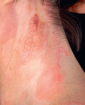 Pityriasis (tinea) versicolor due to Malassezia spp. Yellowish-white, yellow–green, golden, copper–orange