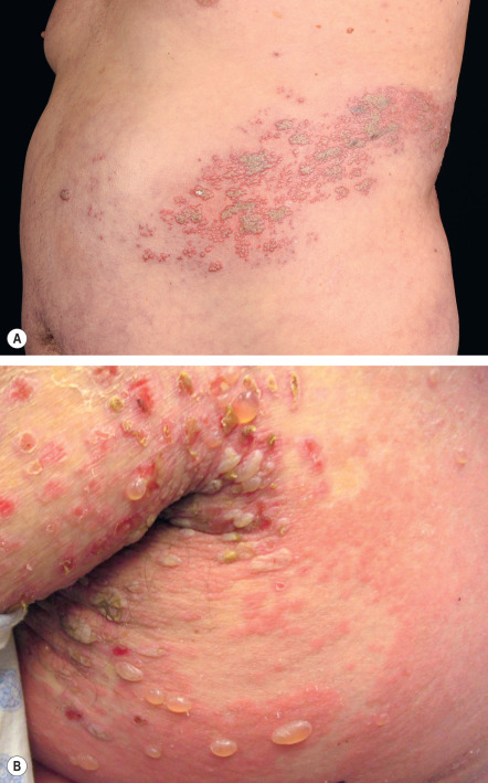 While disparate in etiology, herpes zoster ( A ) and bullous pemphigoid ( B ) result in a similar morphology – namely, cutaneous vesicles and bullae.
