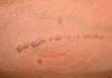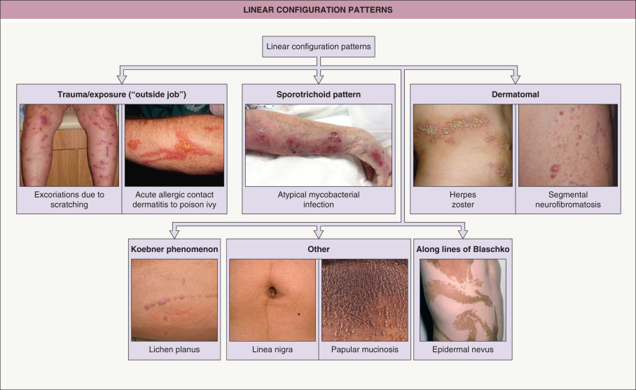 • Favors trunk and proximal extremities; may have inverse pattern (axillae & groin); long axis of lesions parallel to skin cleavage lines