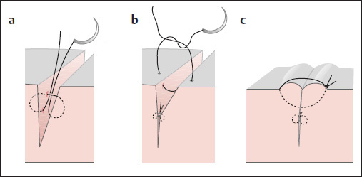 a–c Simple interrupted suture. a Subcutaneous approximating suture of absorbable material, with a buried knot. b The entrance and exit points are placed symmetrically. c The suture is tightened, slightly pursing the wound margins, and is tied on one side.