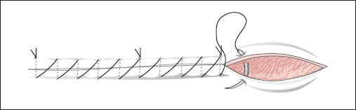 Over-and-over continuous suture, intermediate knot after four stitches.
