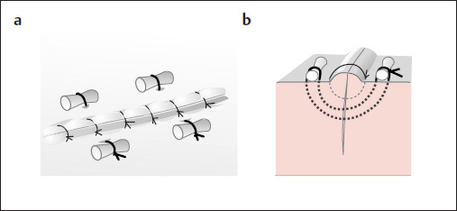 a, b a Mattress sutures can be used to reinforce a suture line that is under tension. The monofilament threads are tied over bolsters consisting of swabs, silicone tubing, etc. b Schematic view in cross-section.