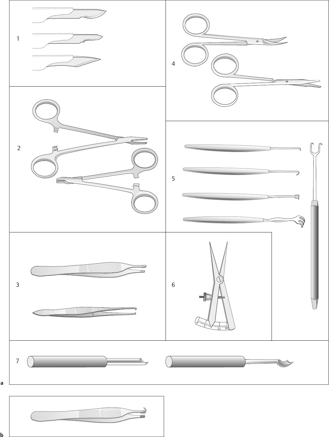 We additionally use ⑨ fine, single- and double-prong hooks for holding and manipulating the flaps. A good alternative is the Weerda hook forceps ⑩ ( Fig. 2.7e ). Ordinary forceps should not be used, as they are liable to crush the flap margins. Other important accessories are a millimeter rule ⑪ and a caliper ⑫ ( Fig. 2.7f ) and sterile skin markers or methylene blue marking pencils. We use an assortment of craft knives for carving and sculpturing cartilaginous frameworks (e.g., for an auricular reconstruction; see Fig. 2.7a ⑦ and g ).