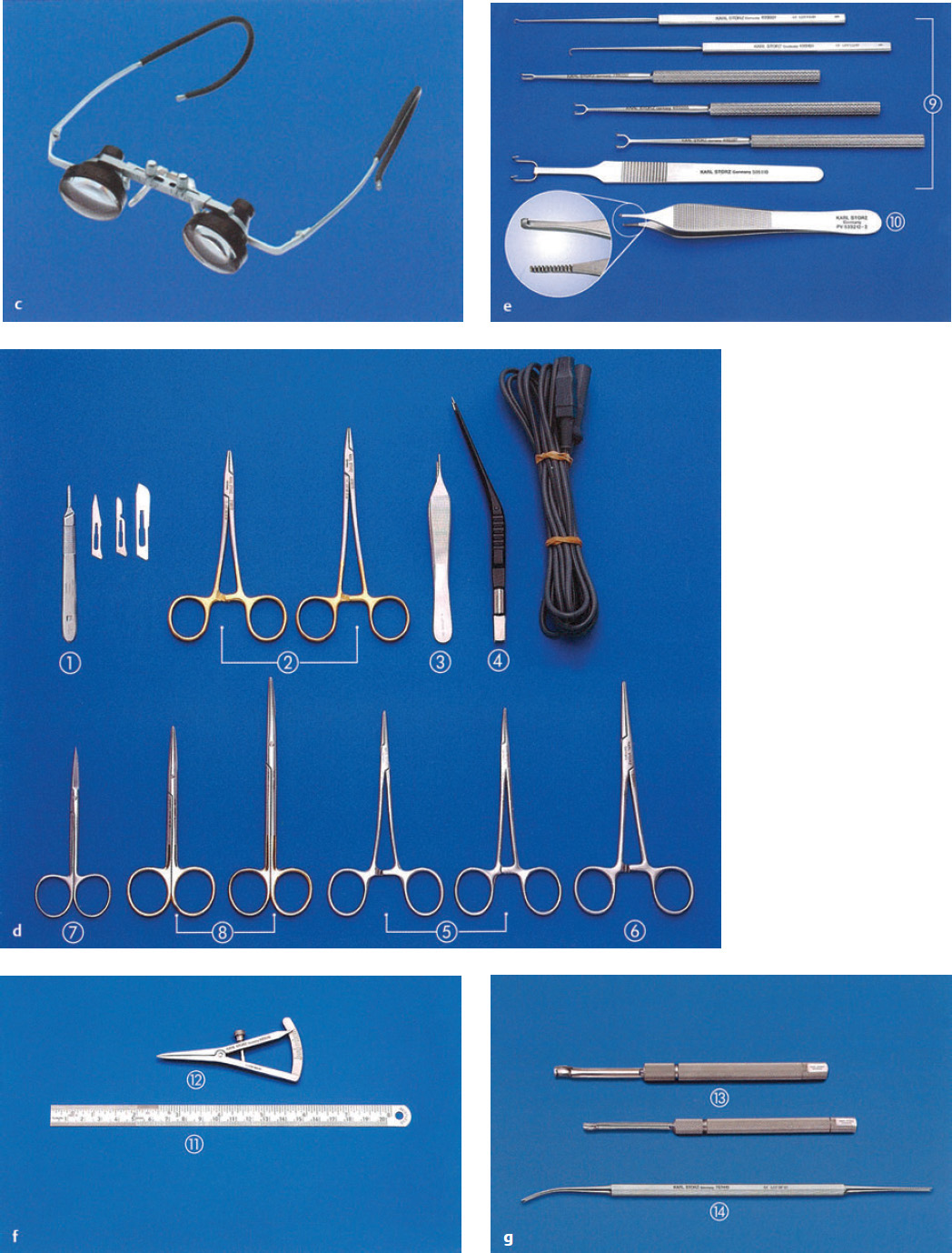 The high-quality basic instrument set consists of the following items ( Fig. 2.7d ): ①) scalpels with no. 11, no. 15, and no. 19 blades; ② needle holders—one small and one slightly larger, for atraumatic needles; ③ fine tissue forceps (e.g., Adson forceps); ④ fine, angled bipolar forceps for vascular electrocautery; ⑤ two or three small hemostatic clamps; ⑥ mucosa clamps; ⑦ assorted pointed scissors; and ⑧ dissecting scissors.