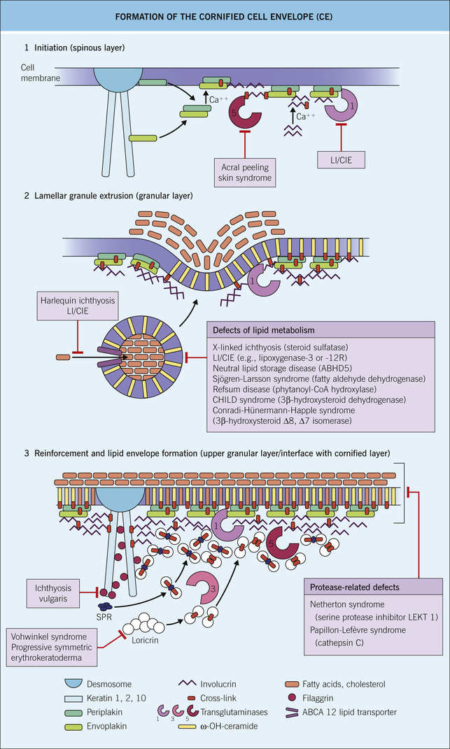 ⟐ Process starts with envoplakin, periplakin, and involucrin scaffolding along the inner cell membrane (which is eventually replaced by ceramides from lamellar granules)