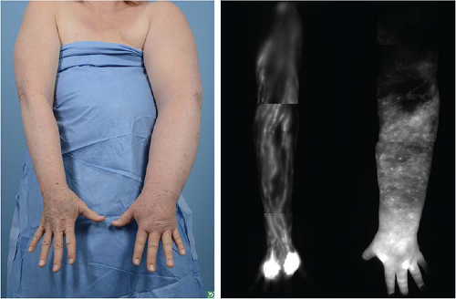 Lymphedema is most commonly diagnosed by clinical examination. Upper limb swelling is typically first evaluated with duplex ultrasound to rule out deep vein thrombosis, and if negative, the patient is referred for lymphedema therapy. Historically, a 10% difference in limb volume was diagnostic for lymphedema. However, significant swelling is a late finding of lymphatic compromise. Patient symptoms of heaviness, transient swelling, and pain typically precede swelling and should be referred for lymphedema therapy. There are technologies that may improve early detection of lymphedema. Bioimpedance spectroscopy (BIS) is a noninvasive test that can detect abnormally high extracellular volume in a limb, consistent with lymphedema. Imaging of the lymphatic system is traditionally performed with lymphoscintigraphy. While not particularly sensitive, a finding of dermal backflow in the limb is diagnostic (1).