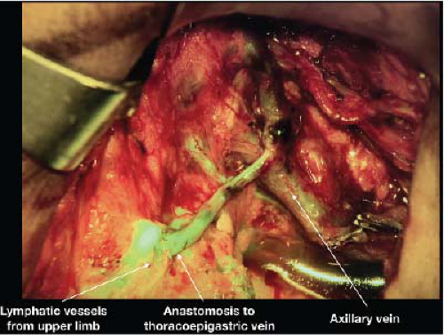 FIGURE 25-3 Immediate lymphatic reconstruction at the time of axillary dissection with lymphovenous bypass of several lymphatic vessels telescoped into the thoracoepigastric vein.