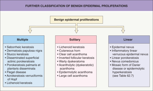 This chapter discusses benign epidermal tumors, ranging from extremely common lesions (e.g. seborrheic keratoses) to less common (e.g. disseminated superficial actinic porokeratosis) to unusual or rare (e.g. warty dyskeratoma, clear cell papulosis). Seborrheic keratoses are seen in the vast majority of older adults; the lesions are papular or verrucous, appear “stuck on”, and vary in color from white to tan–brown to black. A number of entities are related to seborrheic keratoses, including solar lentigines, stucco keratoses, and dermatosis papulosa nigra. The multiple types of porokeratosis are reviewed as are examples of nevi that follow the lines of Blaschko (e.g. epidermal nevus, inflammatory linear verrucous epidermal nevus, nevus comedonicus). Acanthosis nigricans and confluent and reticulated papillomatosis, examples of epidermal proliferation, are also described.