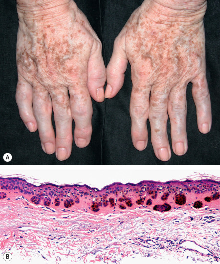 A PUVA (psoralen + UVA) lentigo is a well-defined hyperpigmented macule that commonly develops in individuals undergoing long-term PUVA photochemotherapy (see Ch. 134 ) . These lentigines can arise in any site exposed to UVA light and often persist for years after discontinuation of PUVA therapy. In contrast to solar lentigines, PUVA lentigines usually exhibit a darker brown color and more of a stellate appearance, clinical features that may suggest cutaneous melanoma. Histologically, PUVA lentigines display lentiginous hyperplasia of large melanocytes that often exhibit mild cytologic atypia , and they often contain BRAF mutations . Numerous solar lentigines are also seen in patients with xeroderma pigmentosum, and they are often an initial cutaneous finding (see Ch. 87 ).