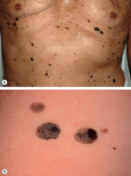 Solar lentigines are well-circumscribed, round, oval or irregularly shaped macules that vary in color from tan to dark brown or black. More lightly pigmented lesions are usually homogeneous, whereas darker ones tend to have a mottled appearance. Solar lentigines almost always present as multiple lesions. They usually vary in diameter from 3 mm to 2 cm and can become confluent. Solar lentigines occur in sun-exposed sites, predominantly the dorsal aspects of the hands and forearms, face, upper trunk, and shins ( Fig. 109.2A ).