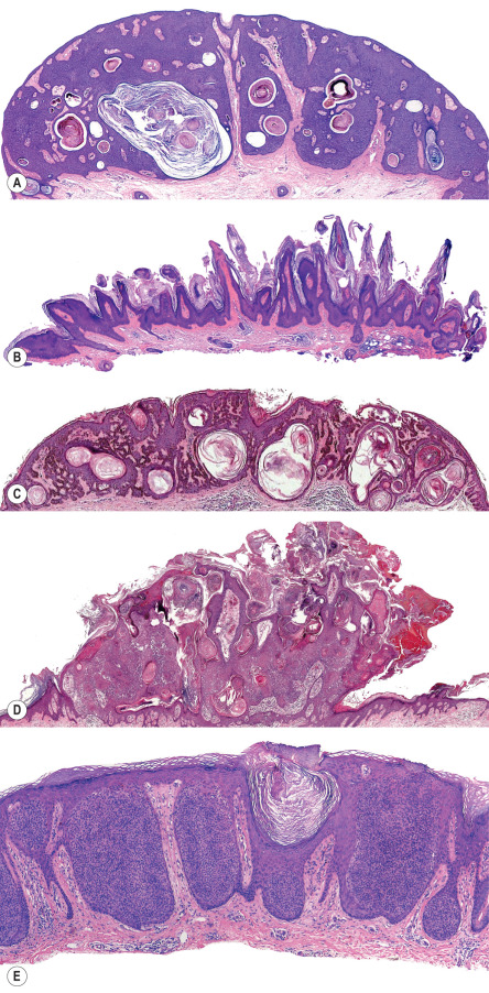 Verrucae and condylomata acuminata are hyperplasias caused by HPV. Both can clinically mimic SKs but differ in that they most frequently occur in younger individuals. Verrucae often present as rough papules with pinpoint red or black dots that represent dilated or thrombosed capillary loops at the tips of the underlying dermal papillae. Verrucae favor acral locations, while condylomata acuminata occur in the anogenital region and rarely on the buccal mucosa. HPV has been reported in anogenital lesions with histologic features of SK (see above). Koilocytic changes of perinuclear vacuolization with nuclear pyknosis in the superficial epidermis may not be present in some verrucae, but are helpful if present. An SK generally tends to be oriented in a more horizontal than vertical fashion, often has horn pseudocysts, and lacks koilocytes.