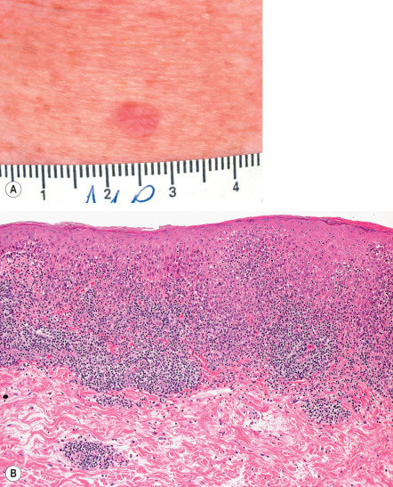 LK has a lichenoid infiltrate composed primarily of lymphocytes with scattered histiocytes ( Fig. 109.5B ). Eosinophils and plasma cells are sometimes present. All other elements of an interface dermatitis are observed, including basal vacuolar alteration, melanin incontinence, and colloid bodies. When melanin incontinence is prominent, the term pigmented lichenoid keratosis is sometimes used. Parakeratosis may be seen, unlike in typical lichen planus. Sometimes there is frank separation of the epidermis from the infiltrate in the dermis, giving rise to a subepidermal cleft or blister cavity. Basal cell proliferation is absent, and keratinocyte atypia is either mild or absent. Changes of a solar lentigo or macular SK are often present at the periphery of the specimen.