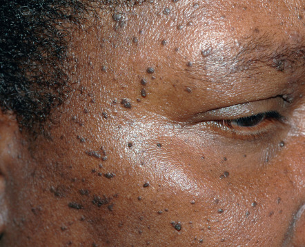 Dermatosis papulosa nigra (DPN) presents as multiple, hyperpigmented, filiform to sessile, smooth-surfaced papules measuring from 1 to 5 mm. The lesions typically develop on the face of darkly pigmented individuals ( Fig. 109.6 ).