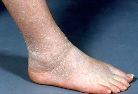 Usually tens, but sometimes hundreds, of gray–white papules are present on the lower extremities of older adults ( Fig. 109.7 ). They favor the ankles and dorsal feet but may extend to the thighs. Occasionally, stucco keratoses appear on the forearms. The lesions are usually small, measuring from 1 to 4 mm; rarely larger plaques are seen. The lesions may be scraped or flicked off the skin surface with a fingernail and there is usually minimal, if any, bleeding. A collarette of dry scale may remain. On occasion, brown, pink and deep yellow shades have been described.
