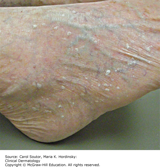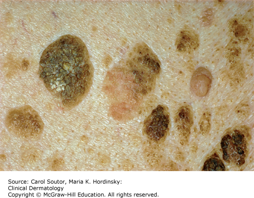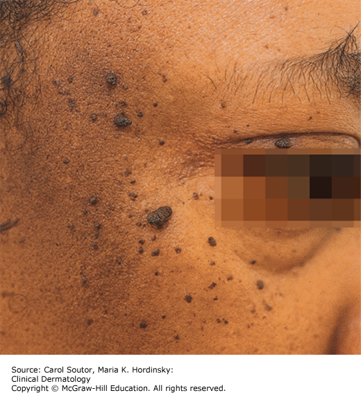 Seborrheic keratoses are present in approximately 50% of adult patients. Many patients present with a history of a changing pigmented “mole” and a concern about melanoma. Patients may complain of pruritus or irritation from clothing. A classic seborrheic keratosis has a predilection for the trunk and presents as a well-defined hyperpigmented papule or plaque with a waxy hyperkeratotic surface, ranging in size from a few millimeters to several centimeters in diameter (Figure 16-1). They are often oval in shape with their long axis following the natural tension lines of the skin. The astute clinician can quickly recognize these lesions and avert the need for a biopsy, but occasionally even with the most trained eye a biopsy is indicated. Variants include the macular seborrheic keratosis of the face and scalp that present as a slightly raised velvety plaque or pigmented macule on the head and neck. These lesions are often misdiagnosed as a lentigo with concern for lentigo maligna melanoma. A facial variant is dermatosis papularis nigra which presents primarily in African Americans with small dark papules (Figure 16-2). Stucco keratosis is another variant and presents as smaller scattered lightly pigmented or white keratotic papules on the distal lower extremities (Figure 16-3).