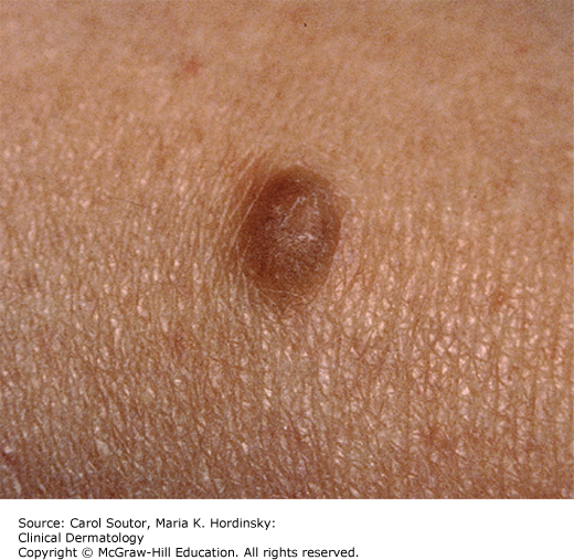 ✓ Nevus: Tan to black macules or papules; surface is not hyperkeratotic or waxy.